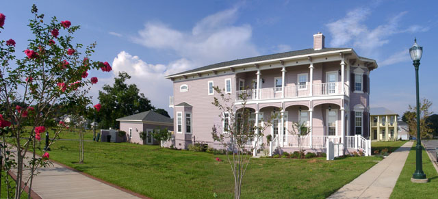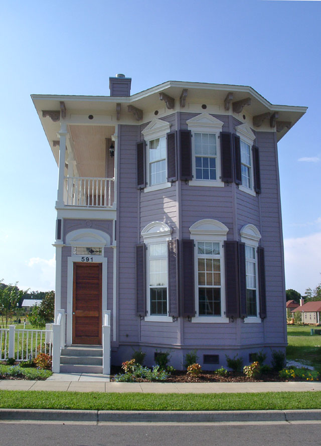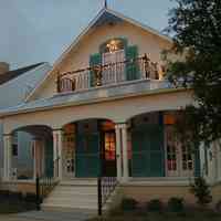 The front facade faces north on Aragon Street. The Charleston style row house is built on a narrow lot with porches on one side.