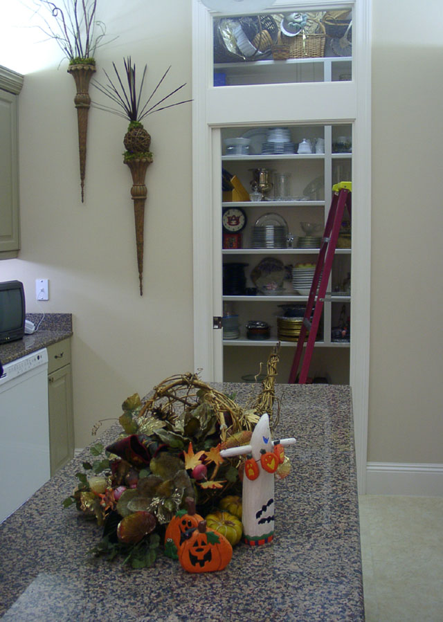 The kitchen is a functional space with a butler's pantry for storage at the back. The counter tops are granite. The taupe colored cabinets provide a soft contrast to the walls.