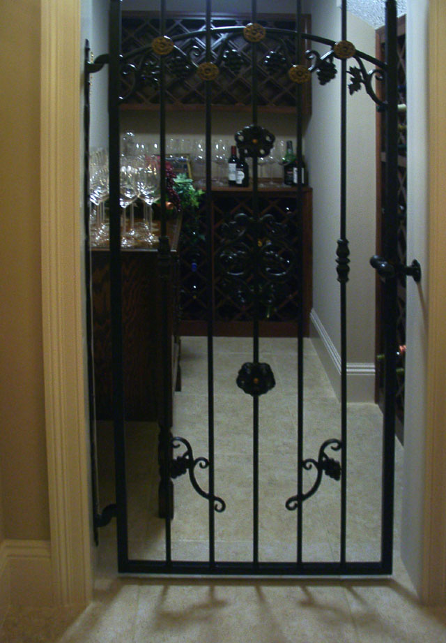 The wrought iron gate was designed and built by Chris Stinson. It leads to an under-the-stairs wine cellar.