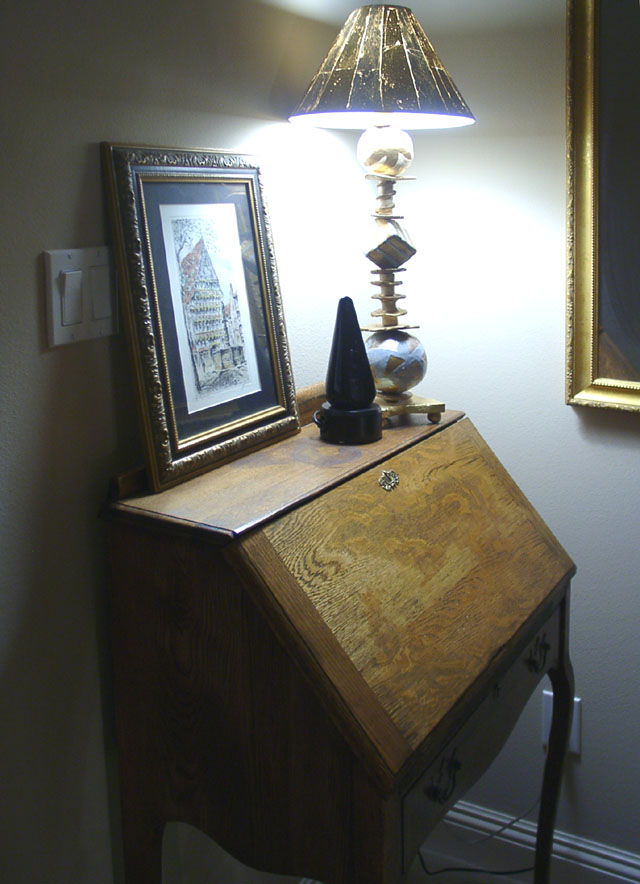 A writing desk creates a point of interest in the upstairs hall.