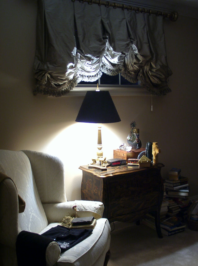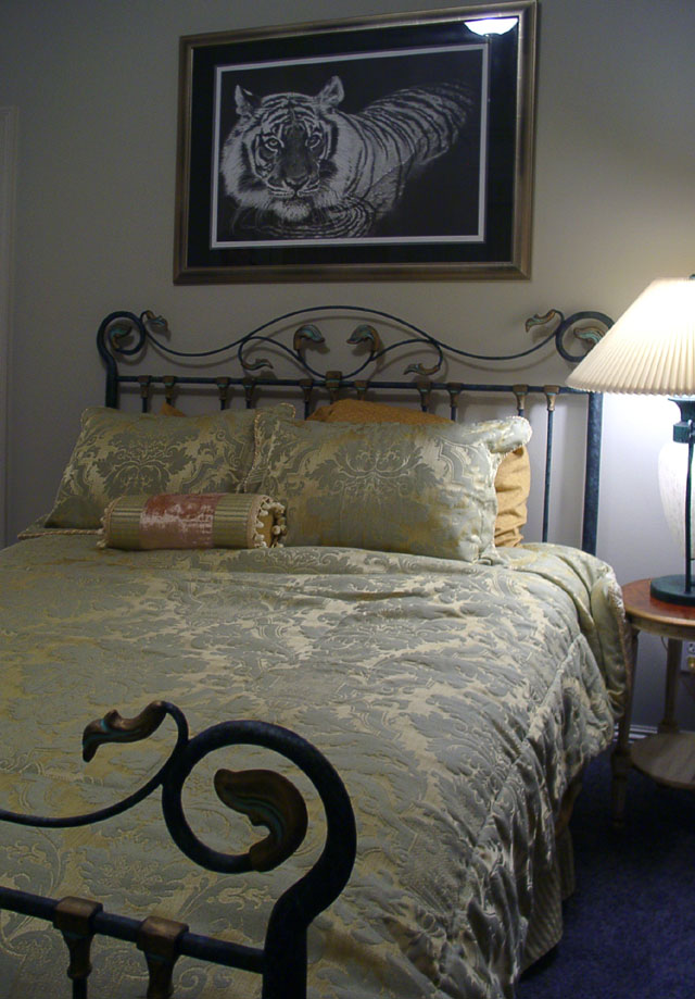 Tip McAlpin of McAlpin's Interiors designed the raw silk draperies. The bombay chest is handpainted. Ms. Ritchie is an Auburn graduate, and has tigers throughout the house.