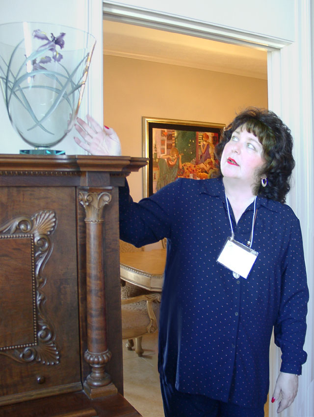 The office is an efficient but feminine space. On the wall are mementos of Ms. Ritchie's public service. The top print is one that was presented to new legislators and was signed by Lawton Chiles shortly before his death. The bottom print is signed by artist Leroy Niman. The pocket doors feature beveled glass.
