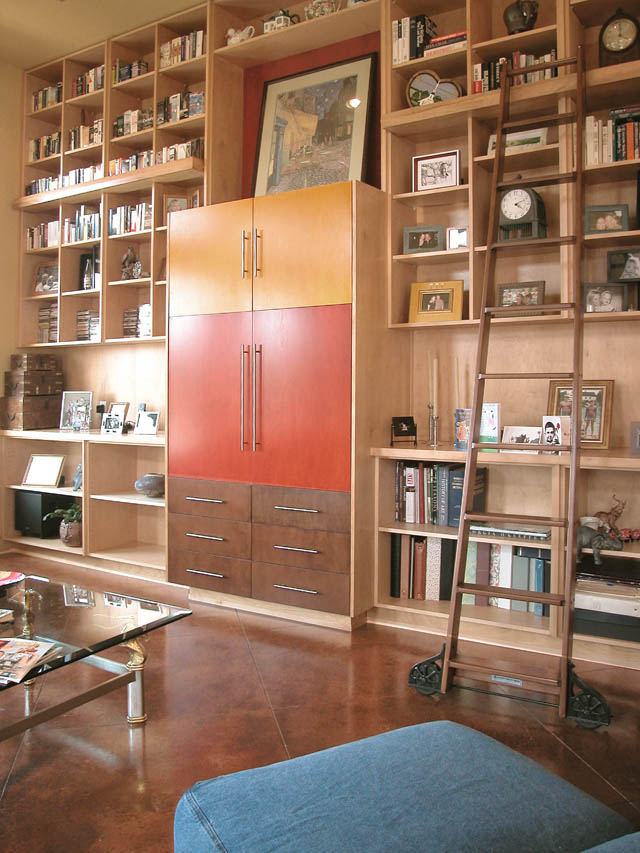 The library ladder was fabricated in California. Spike is a tiger-striped tabby. He accompanies the Hubers from room-to-room and is a cooperative photo subject.