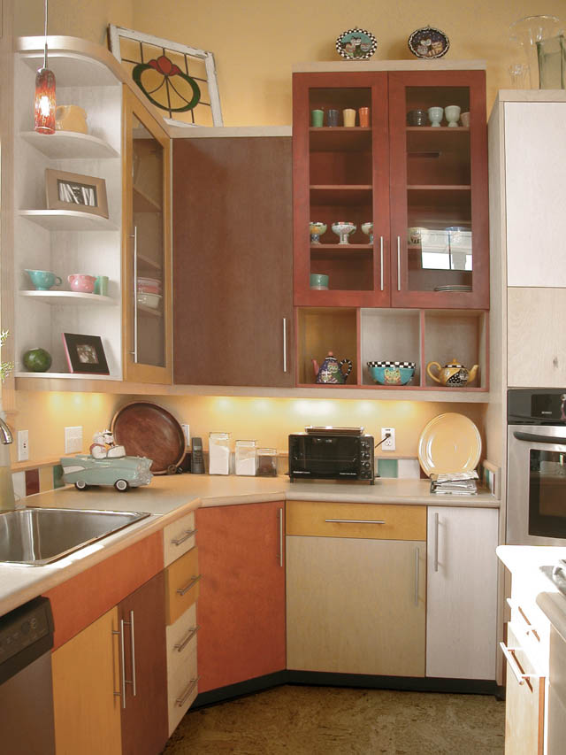 The wooden cabinets are finished in a unique range of muted primary colors.