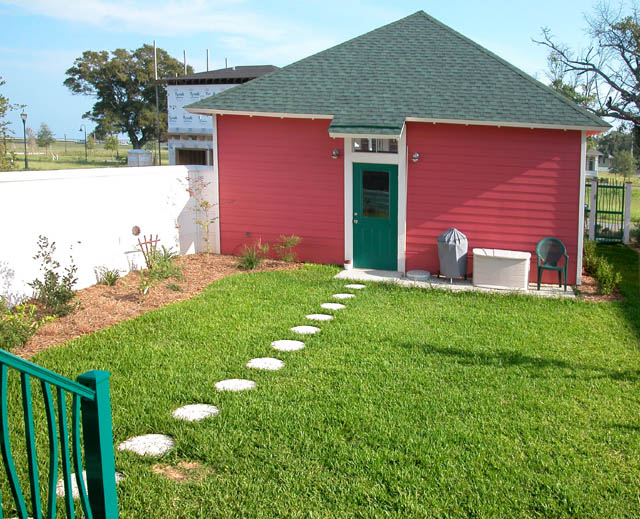 The rear storage building can be seen through the kitchen window.