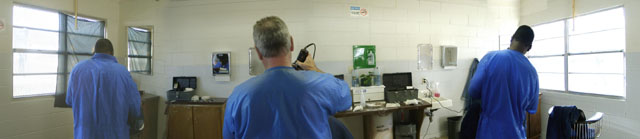 The Officers Station in the “secure cell housing” area facilitates survillence of the inmates quarters. -