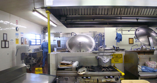 The kitchen is located in the Food Service Building in the program area of the facility. -
