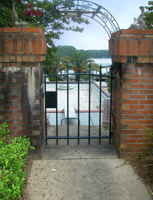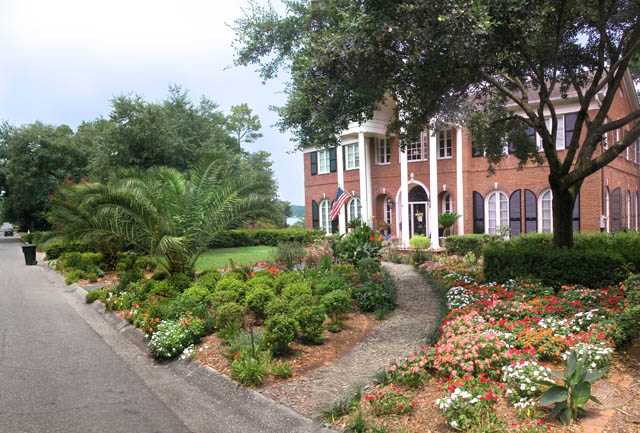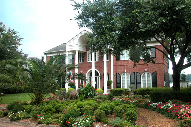 The home is located on Bayou Texar. The style is neoclassical with a traditional portico of white classical columns.