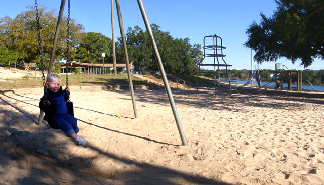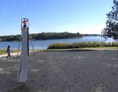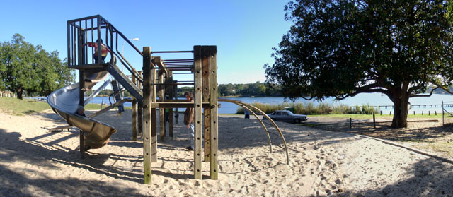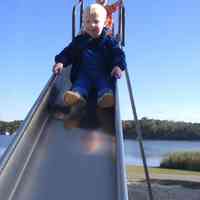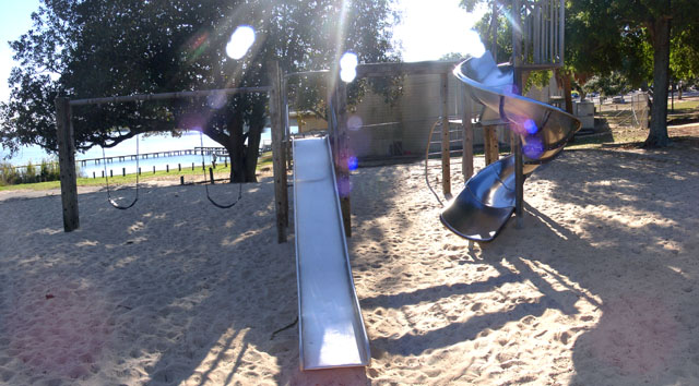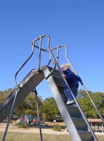 The brightly colored plastic playground equipment that can be seen in the background is deserted in favor of the high slide. -