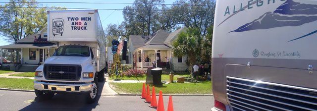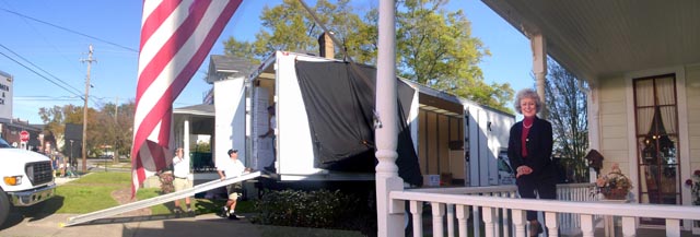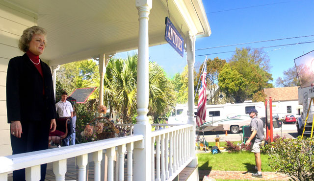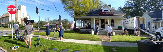 The crew observes the action on the front porch of the cottage. -