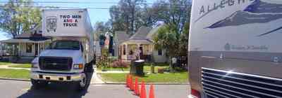 The street is blocked between the motor home and the antique shop. -