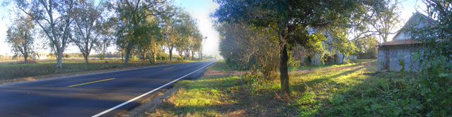 An abandoned farmstead nestles among pecans and oaks beside the highway. -