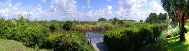 The house is visible in the upper right of the frame. The photograph is taken from the vantage point of the channel, facing southeast. The swing is on the lower right of the frame. -