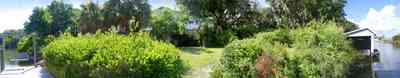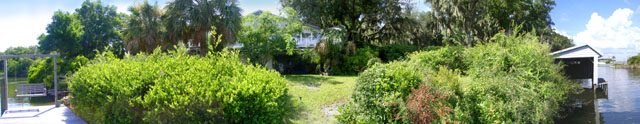 The 180 degree view of the waterfront shows the boat house on the right and the deck swing on the left of the frame. The house is barely visible in the center. -