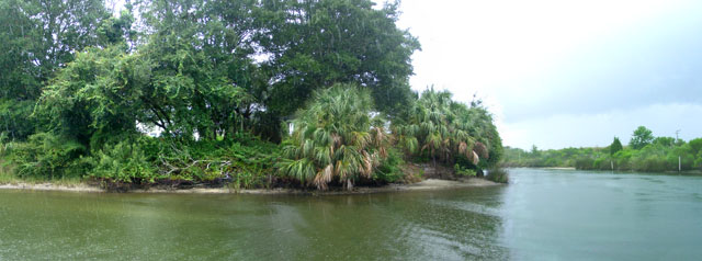 Dead Man's Island is the left bank of the channel leading out into Escambia Bay. -