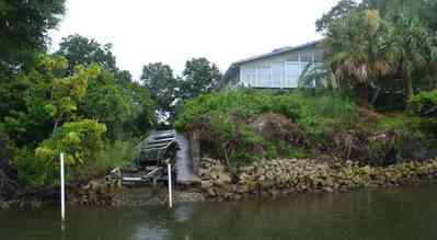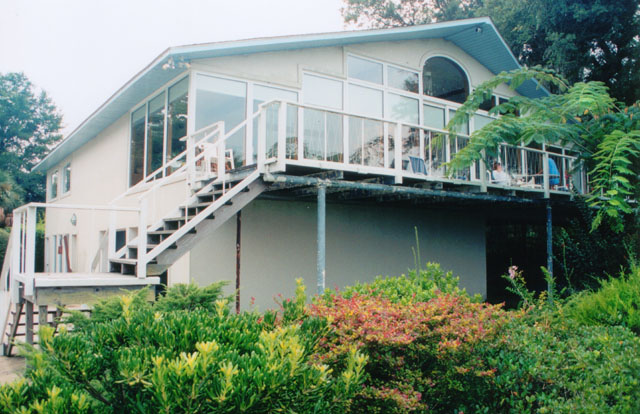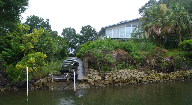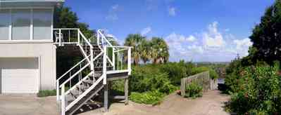 The stairs are located on the east side of the house. The boat ramp for access to the bay can be seen on the right of the picture. -