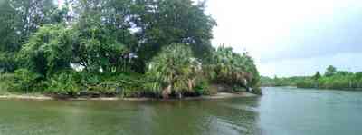Dead Man's Island is directly across the channel from the house. Palms, sea grass and small trees grow on the island. -