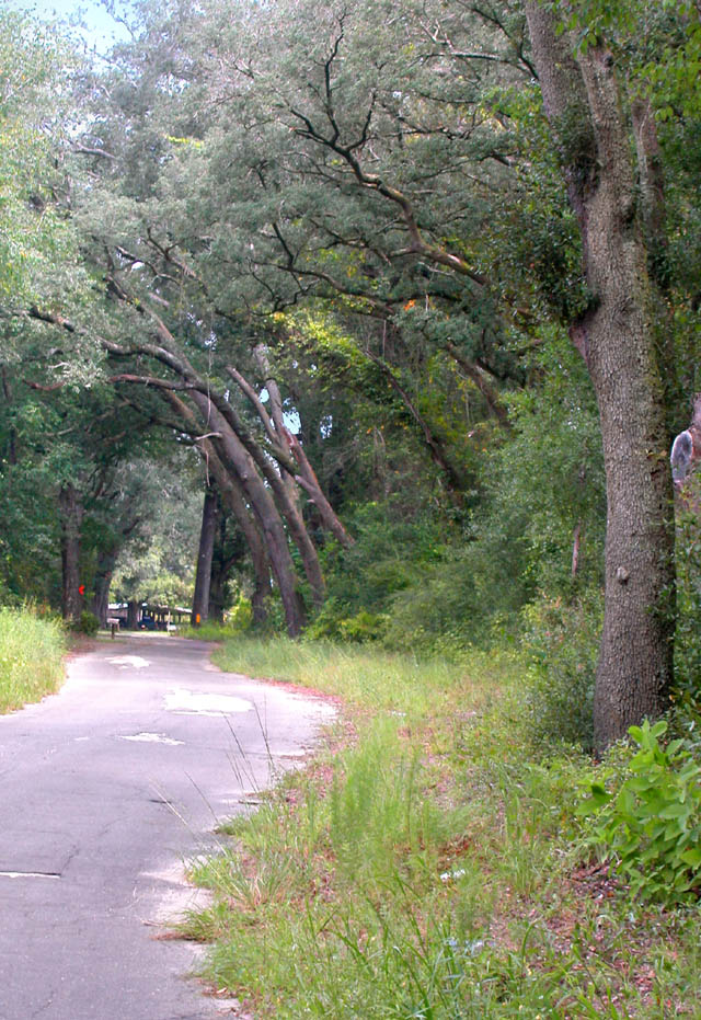 Oak trees form a canopy over the road. -