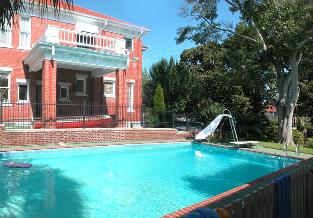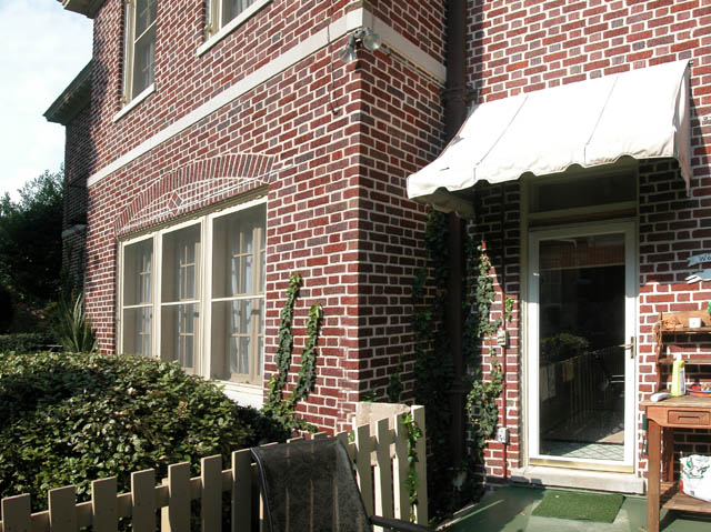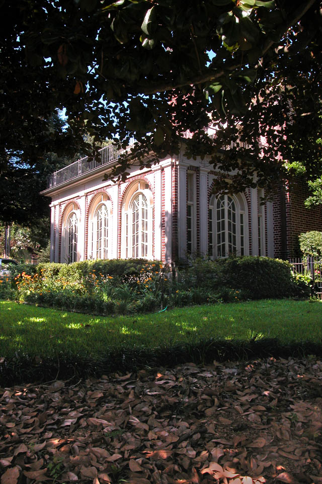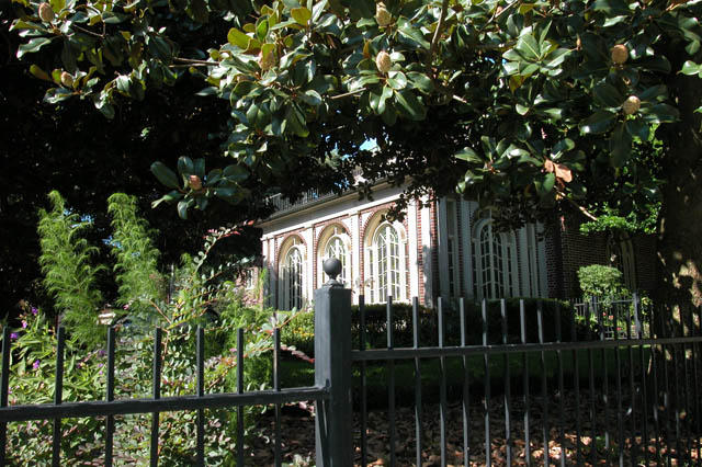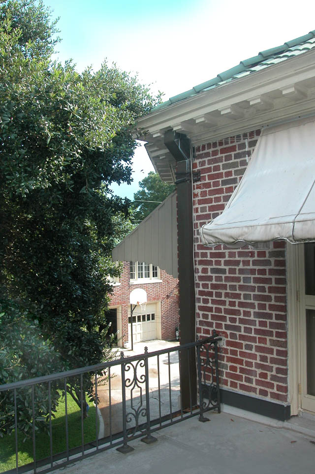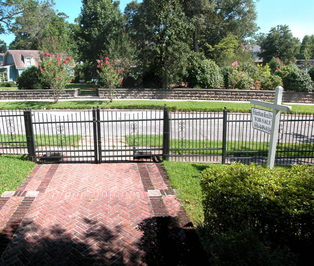 There is a wrought-iron fence on the north and east sides of the house. The east facade features the one-story Florida room.