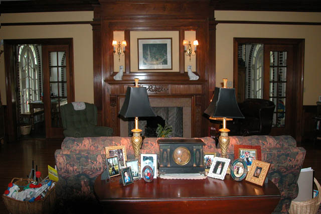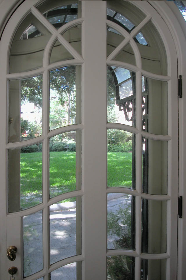 The windows on the first floor extend from floor to ceiling in an arch design using leaded glass panes. The doors are built in double sets.
