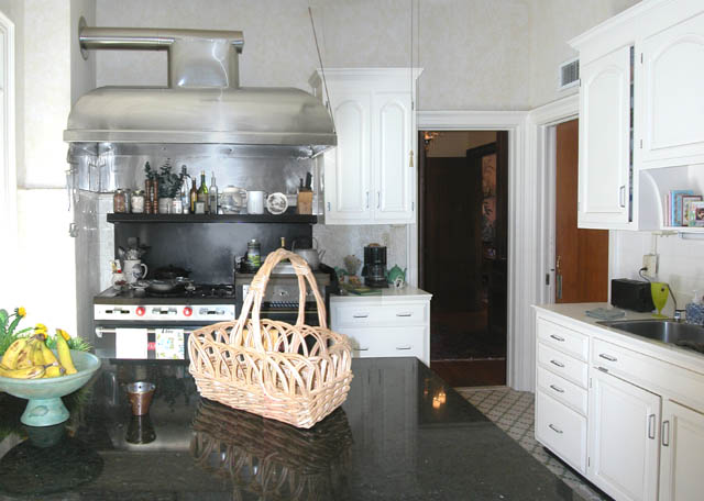 The kitchen and dining room are alongside of the west side of the house. The pool can be directly accessed from the kitchen.
