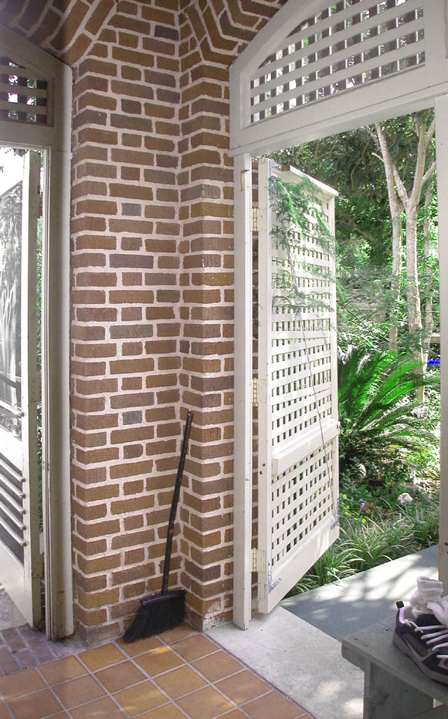 The Florida Room is finished in a unique red-brick trim, accenting the arched windows.