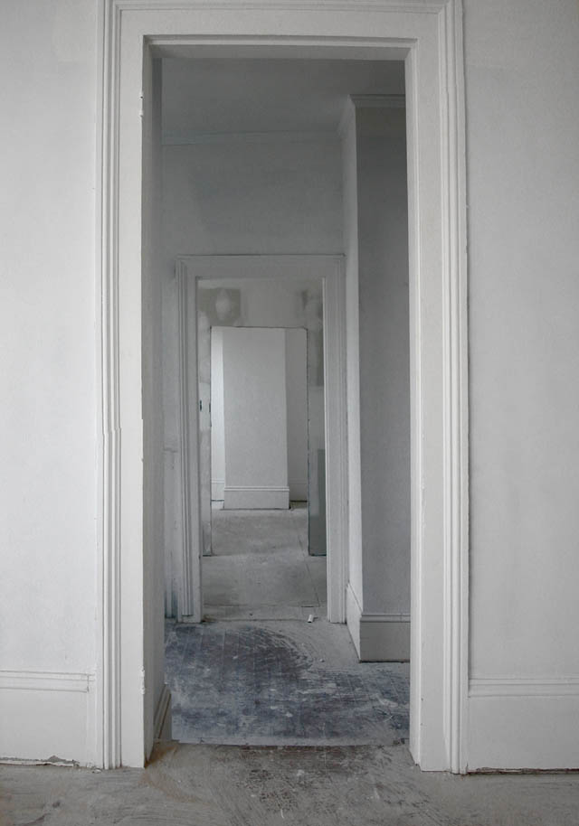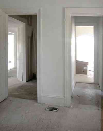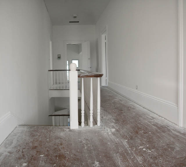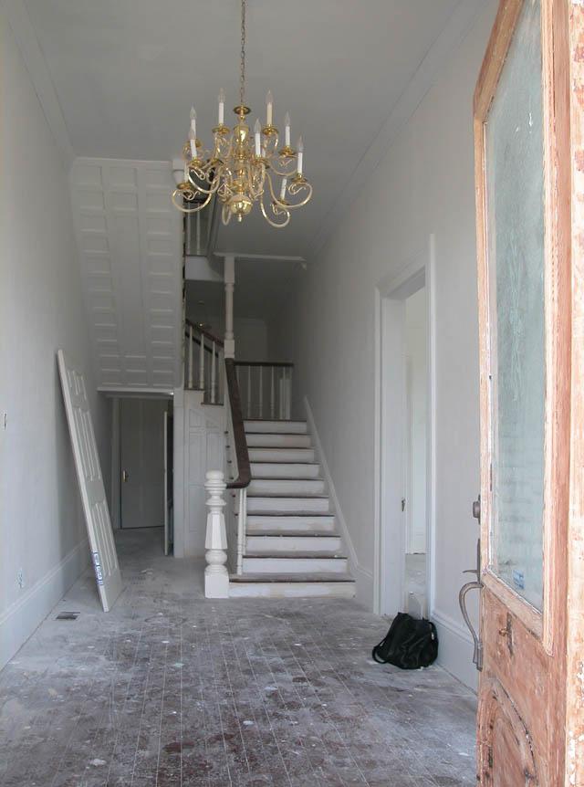 There is a front porch set back on the east side of the facade. This is a view from the central hall. -