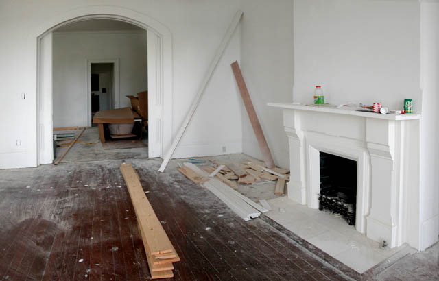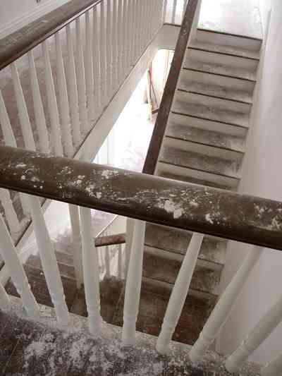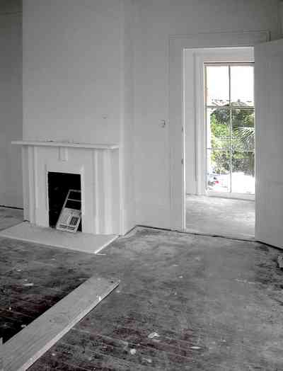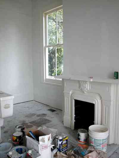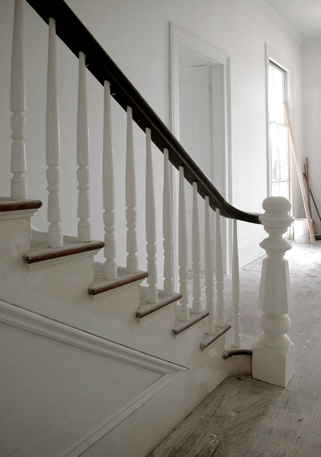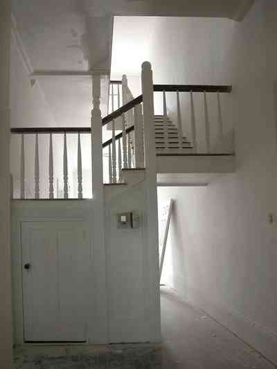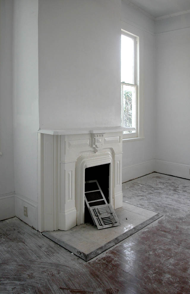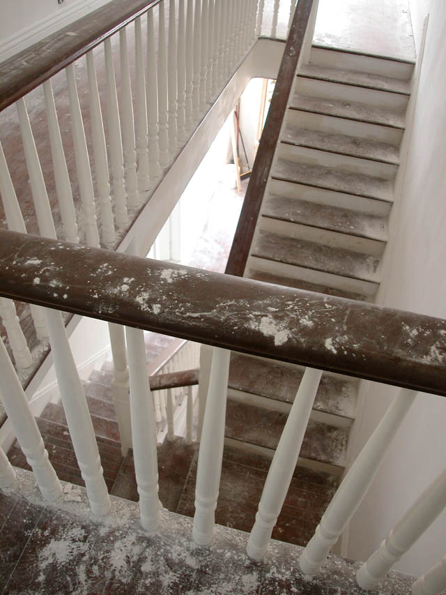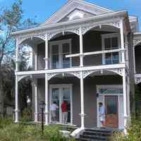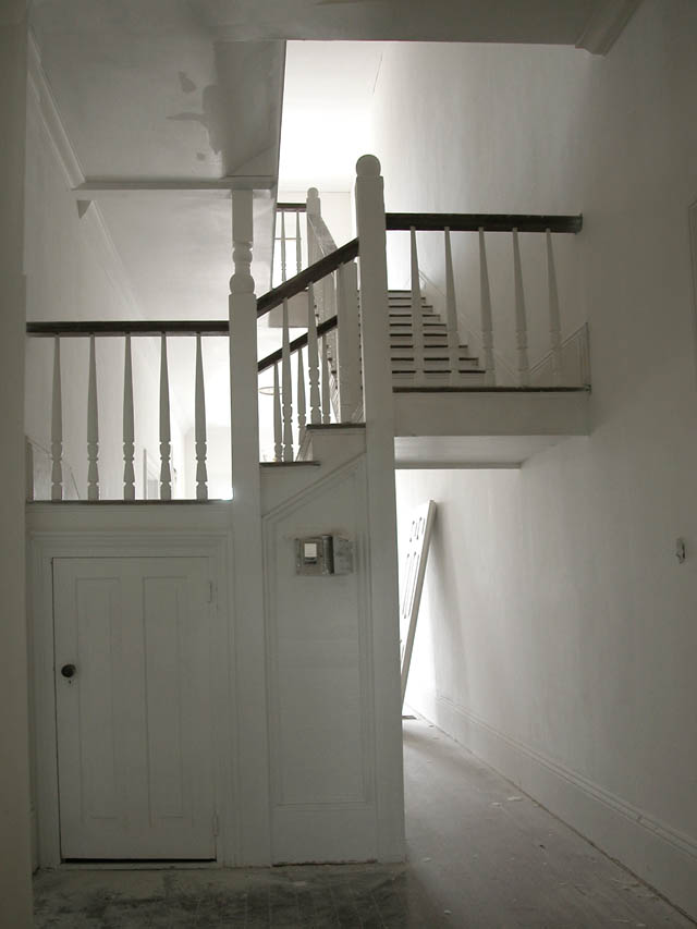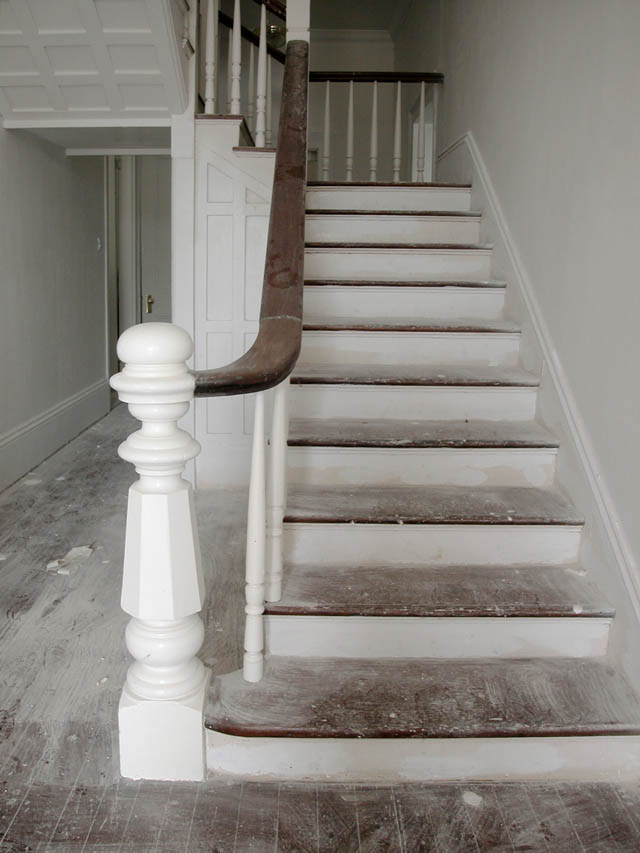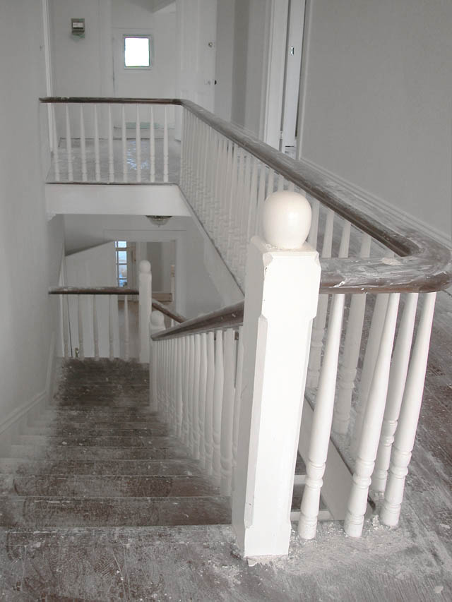 The Victorian house is in the process of being converted from an office into a residence. The design of the gingerbread coumn brackets is art nouveau, a style of decoration developed in France at the end of the 19th century characterized by flowing lines and curving organic shapes. -