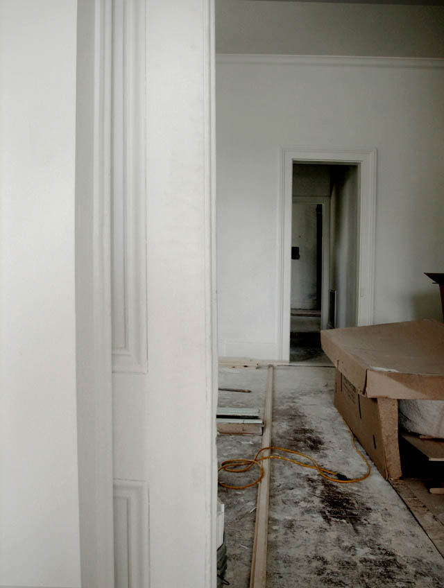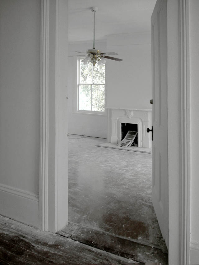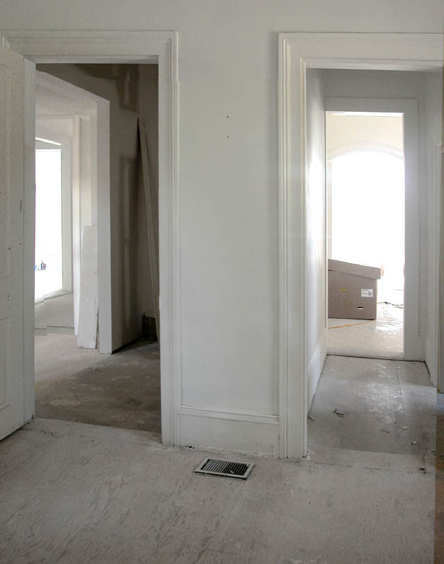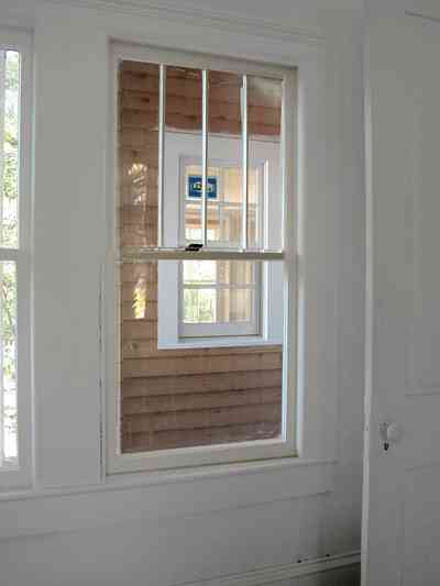 The bay window is on the west wall of the house in the front parlor. The pocket door pictured above is on the right of this frame. -