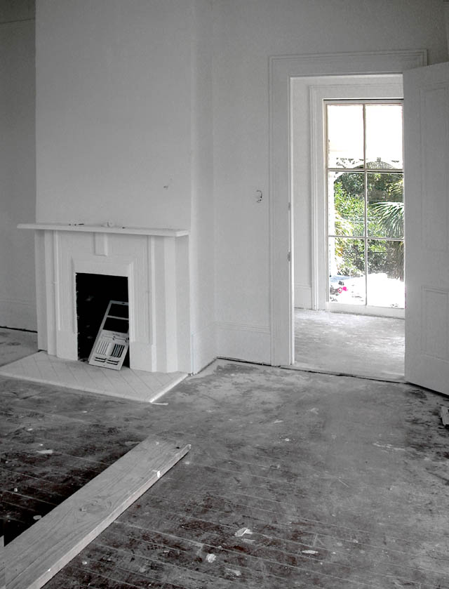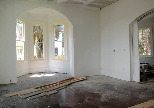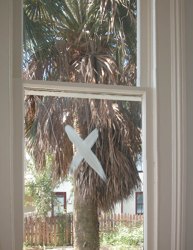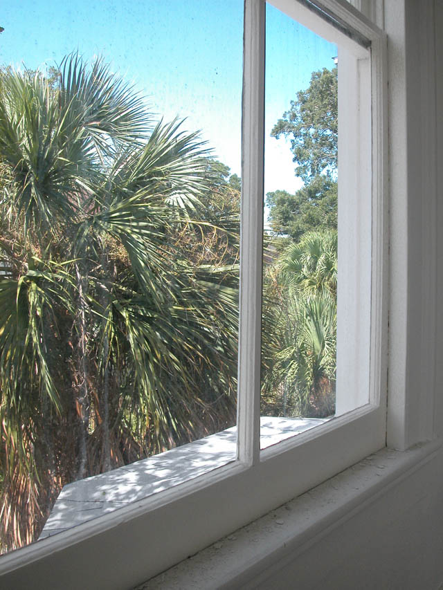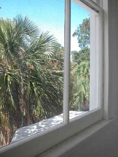 The view of the palm tree can be seen through the central panel of the bay window in the front west parlor. -