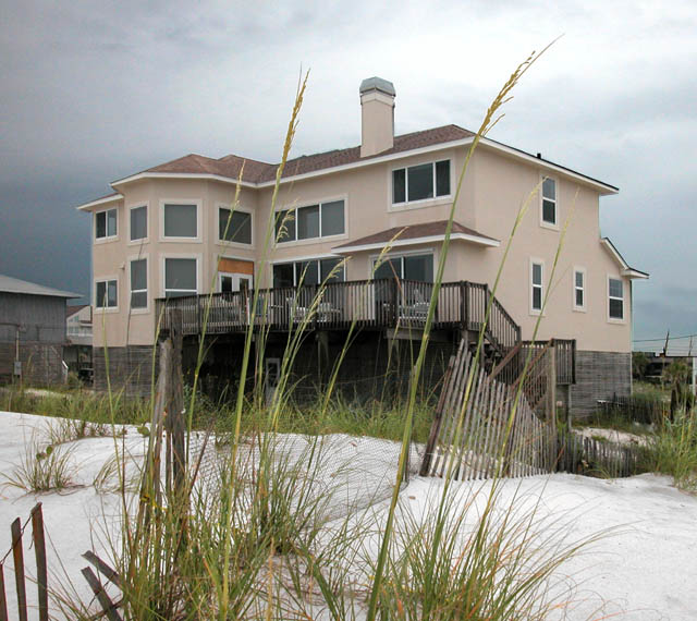 The 5,500 square foot home is located on the Gulf of Mexico. The lot is 100 feet wide with a distance of about 300 feet to the water. There is 4000 square feet of living space on the second and third floors. The first floor is used for a double garage and storage space.