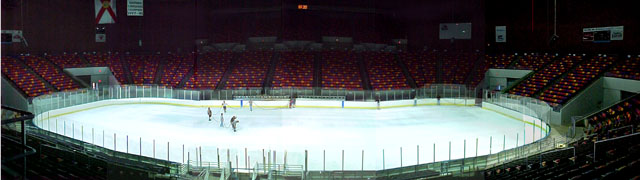 The ice skating rink is being prepared for an Ice Pilot's game. -