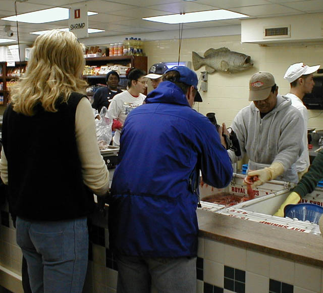 Cameraman, Tom shoots a bin of shrimp at Joe Patti's Seafood Market on Main Street in Pensacola during the preparation of the television program for the Outdoor Learning Channel's, Adventure Crusoe. -