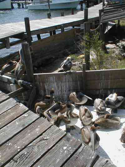 Pelicans gather in a protected spot alongside of the dock at Joe Patti's Seafood Market on Pensacola Bay.