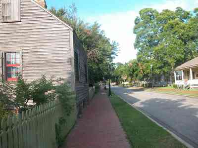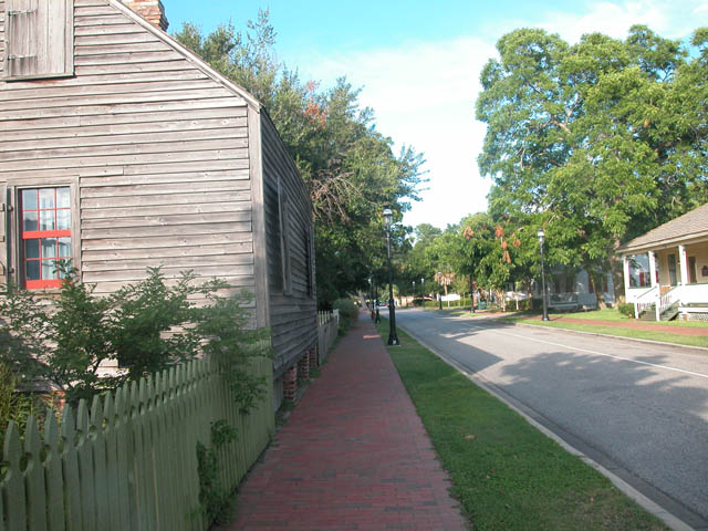 The Julee Cottage is on the north side of Zaragoza Street. The Weavers Cottage can be seen on the right. The cottage rests on brick piers, a typical building feature of early Gulf Coast homes. This slight elevation to the building helps provide air circulation.