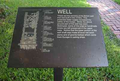 The text of the historical marker reads as follows: These are the remains of the British well that was built in the 1770’s. This protected water supply increased the safety of the troops. While the above ground part of the well has been destroyed, some of the original handmade bricks are still preserved in the upper rows. Notice that the lower portion of the well shaft was made of local red sandstone and of grantite ballast which came from Europe in sailing ships.