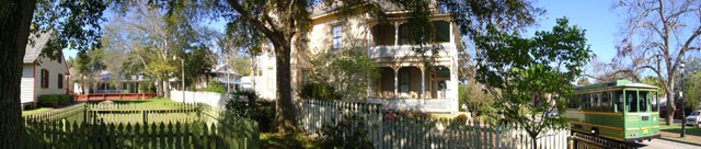 West side view of the Lear House. The Lavalle Cottage is on the left of the frame. The Zaragoza Street trolley can be seen on the far right