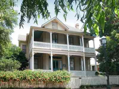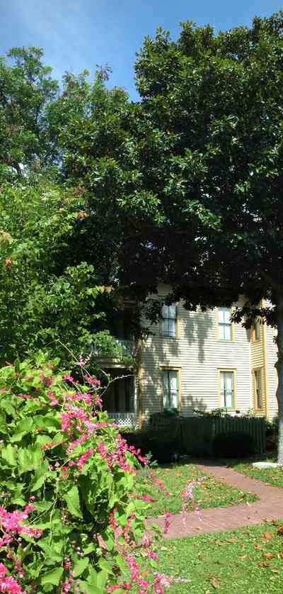 The picket fence along Zaragoza Street provides a place for blooming vines. The east side of the Lear House is in the background.