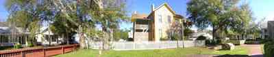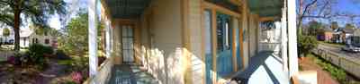 A view from the west side of the first floor front porch. Zaragoza Street can be seen on the right and the interior yard of the home is on the left. The Lavalle Cottage Museum is in the far left corner of the site. There is a common kitchen garden and courtyard between the buildings.