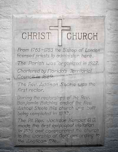 During the recent church renovation an archaeology study revealed graves of the lost rectors. These three men were the first three rectors of the church. Until 1988, it was only a locally accepted legend that they were indeed buried under the church. Some tales even said that Union troops disentombed them in search for valuables. Dr. Judy Bense of the University of West Florida Archaeology Institute found evidence that the legned may have some validity. The white marble memorial plaque inlaid into the wooden floor is located in the center of the photograph.