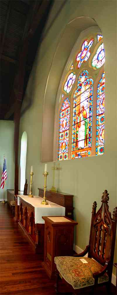 A major renovation of the building took place betwen 1878 and 1879. Dr. Scott’s report for 1879 for the Diocese of Florida states that he had a stained glass window “Light of the World” installed over the altar as a memorial to the late Rt. Rev. Francis Huger Rutledge. All of the stained glass windows were moved in 1903 to the new Christ Church where parishioners still enjoy their beauty. A copy of the “Light of the World” window was made by Rambusch, Inc. of New York. The window was given as a memorial to Elby Godwin by his wife Jeanne and their two children, Honey and Elby, Jr.