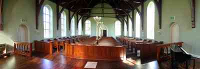 The interior of the building is as much like it was in 1879 as possible. The pews are new and copies of the originals. The lighting is like it was in 1879 when the building was expanded and the roof elevated.