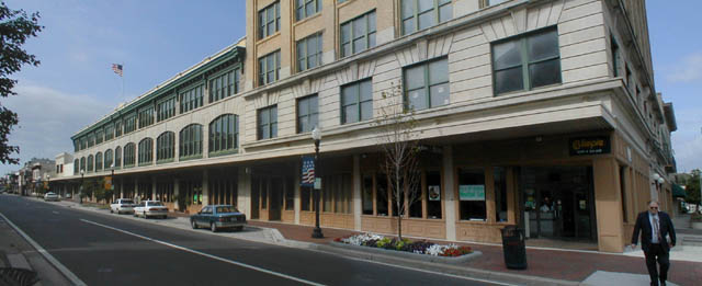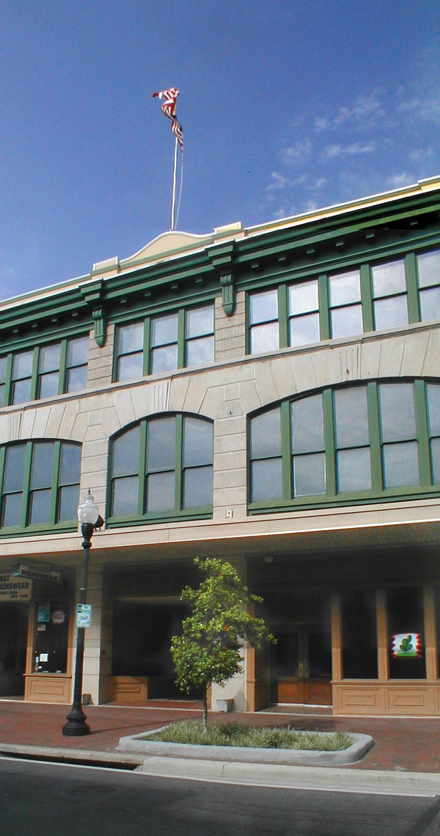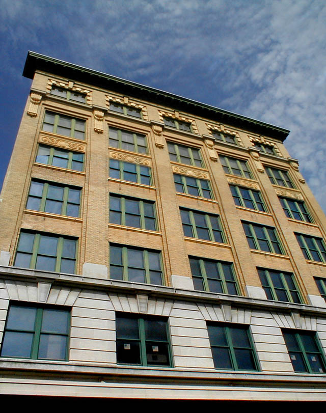 The building dominates the first block of Palafox Place with the three-story addition alongside of the seven story main structure.
