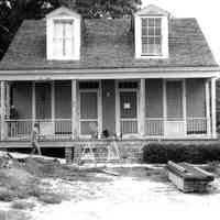 The facade of the home shows a typical view of the shotgun style with a side opening door. The floor plan of such narrow houses usually are configured with a living area in the front room. The house is one room wide. -