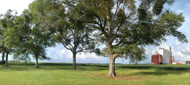 Oak trees line the cotton field adjacent to the Escambia Grain Coop silos. -