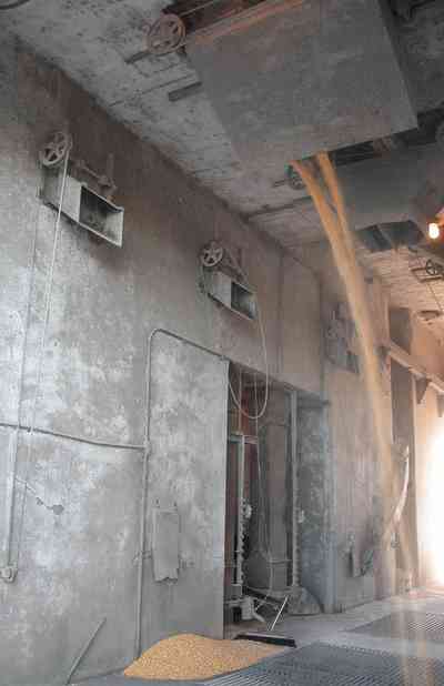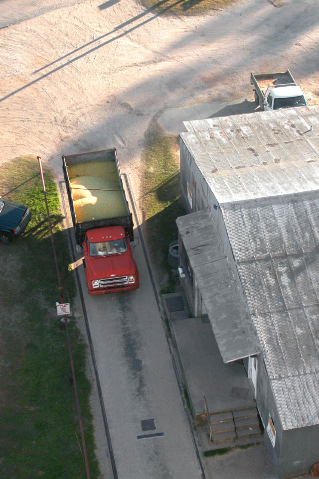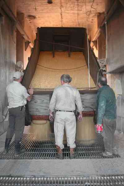 The soybeans are unloaded into "the pit", a 30' underground storage space. Commodities are purchased from the farmers, stored and sold to consumers in amounts up to 5 tons. -