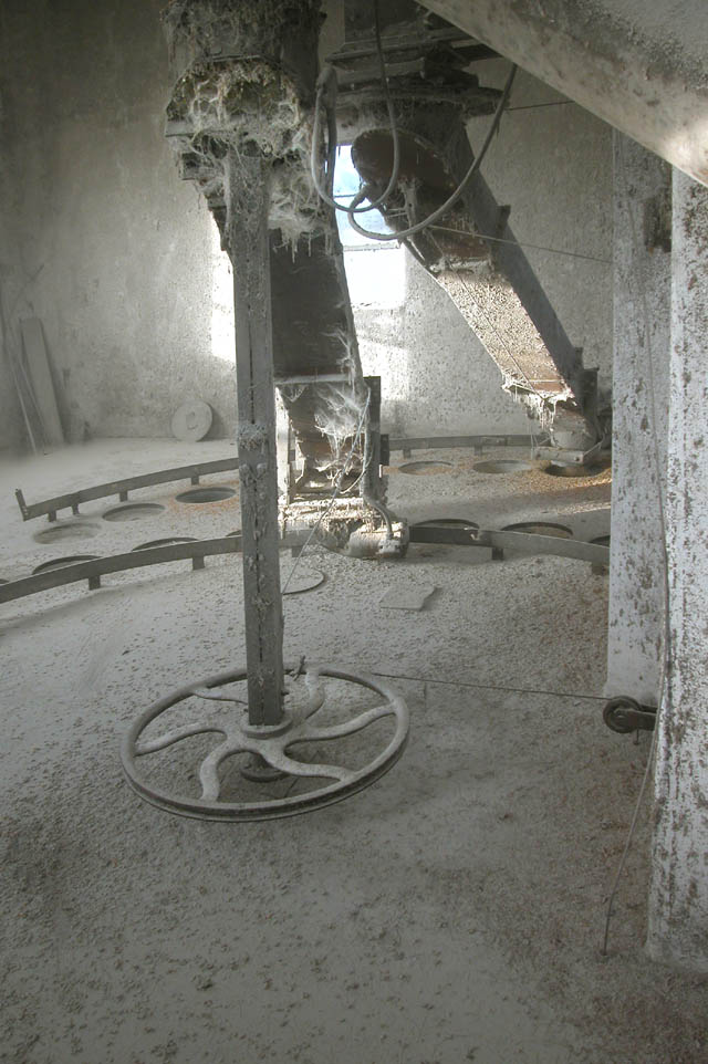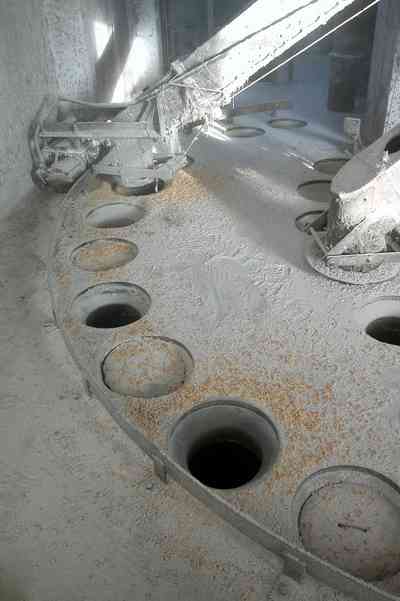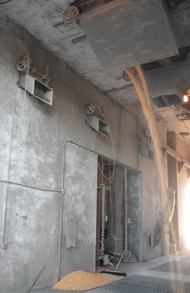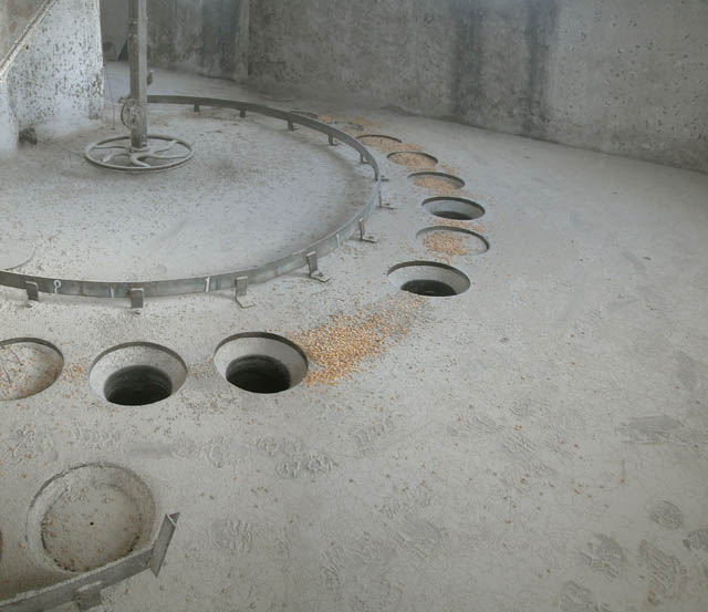 The same area serves as a loading bay. A flow of corn is released from the storage silo. Customers range from hunters and farmers to sales of corn by the truckload, shipped overseas from the port in nearby Mobile. -
