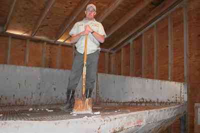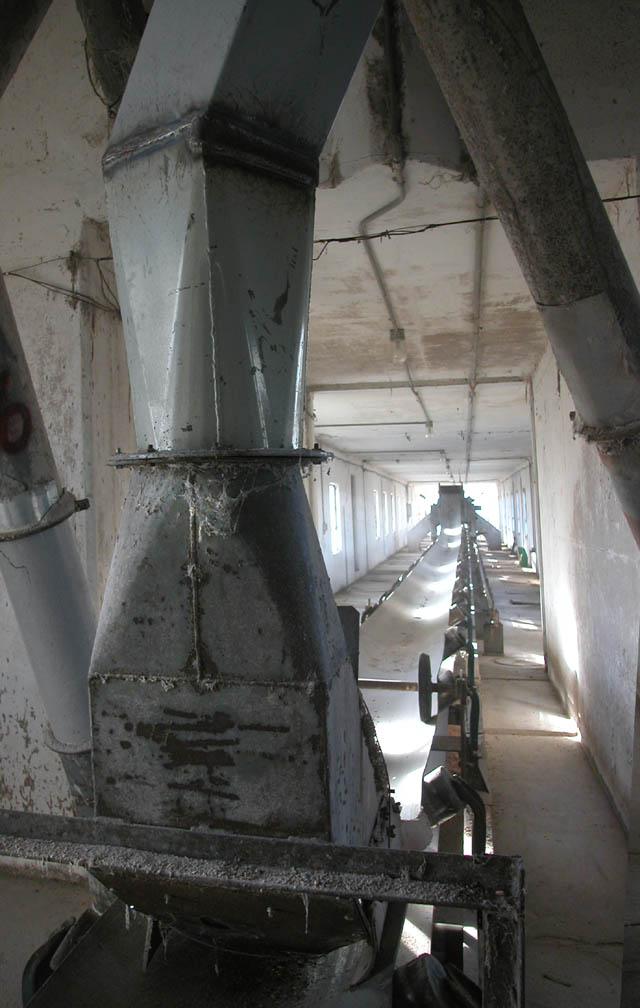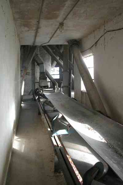 The conveyor belt moves corn up to the top floor of the grain elevator. The belt must be cleaned by hand.