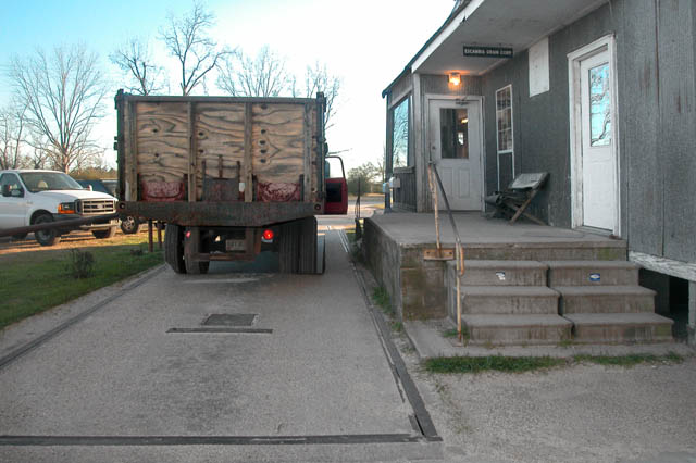 Trucks enter and stop at the office for a weigh-in to establish the amount of product before unloading. -