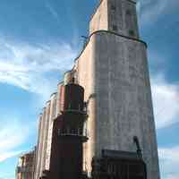 The elevator is approximately 100 feet tall. There are six silos or individual storage bins attached to the main building. -